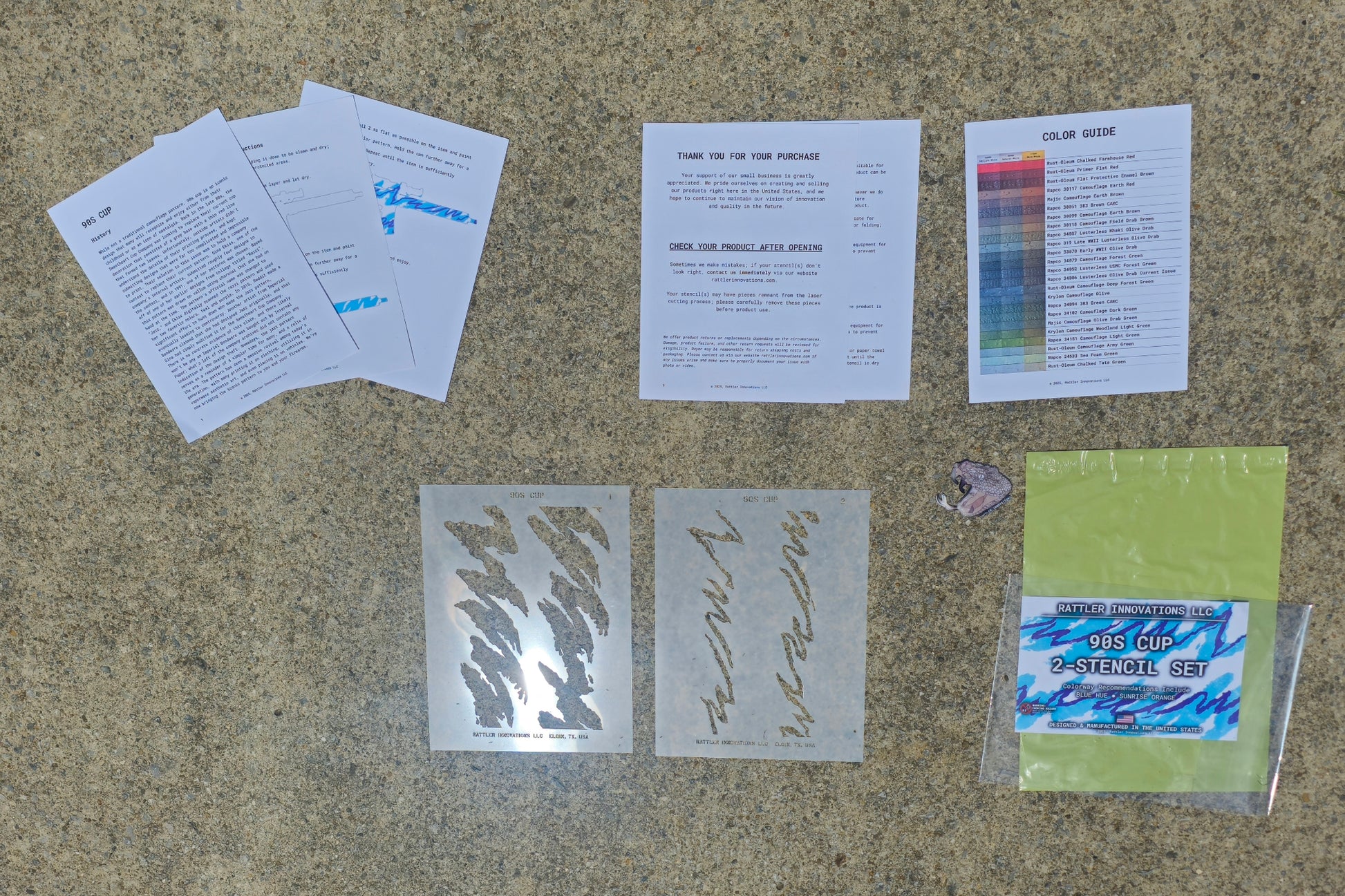 1x Instructions that details the history, usefulness, application, recommended colors, and maintenance of your stencils