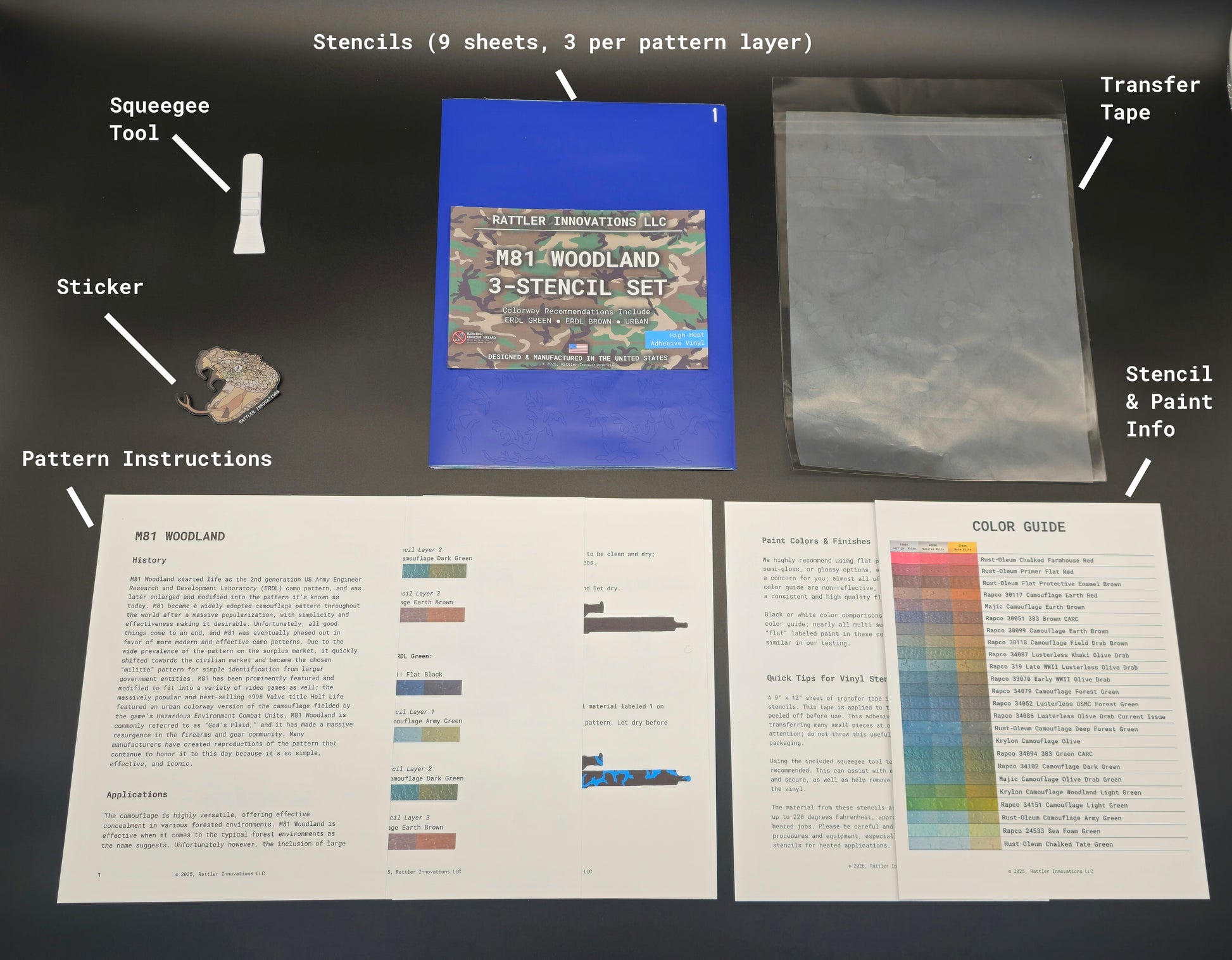 The people's camouflage is here. Trying to match surplus gear? Have an appreciation for God's plaid? Paint your gear in arguably the most popular and recognizable US camouflage pattern with this quality stencil set.